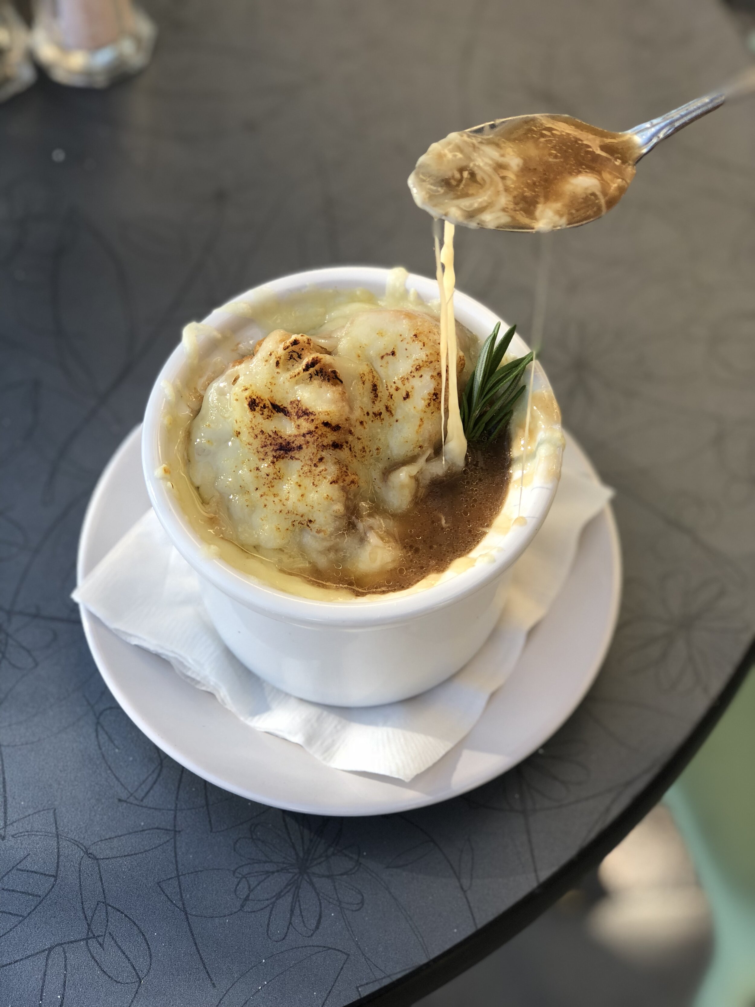 I don’t even have words to express how delicious this soup is. But I can tell you that thyme really accentuates the broth and the provolone and gruyere mixture melted over the noble baguette crouton is absolutely STUNNING.